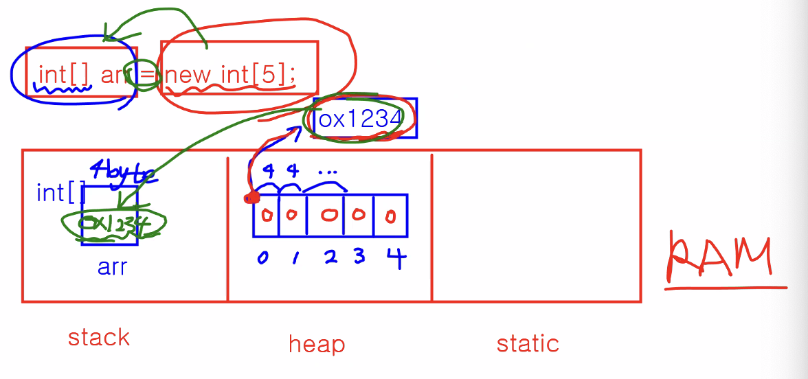 int[] arr = new int[5]; // 초기상태 : [0][0][0][0][0]