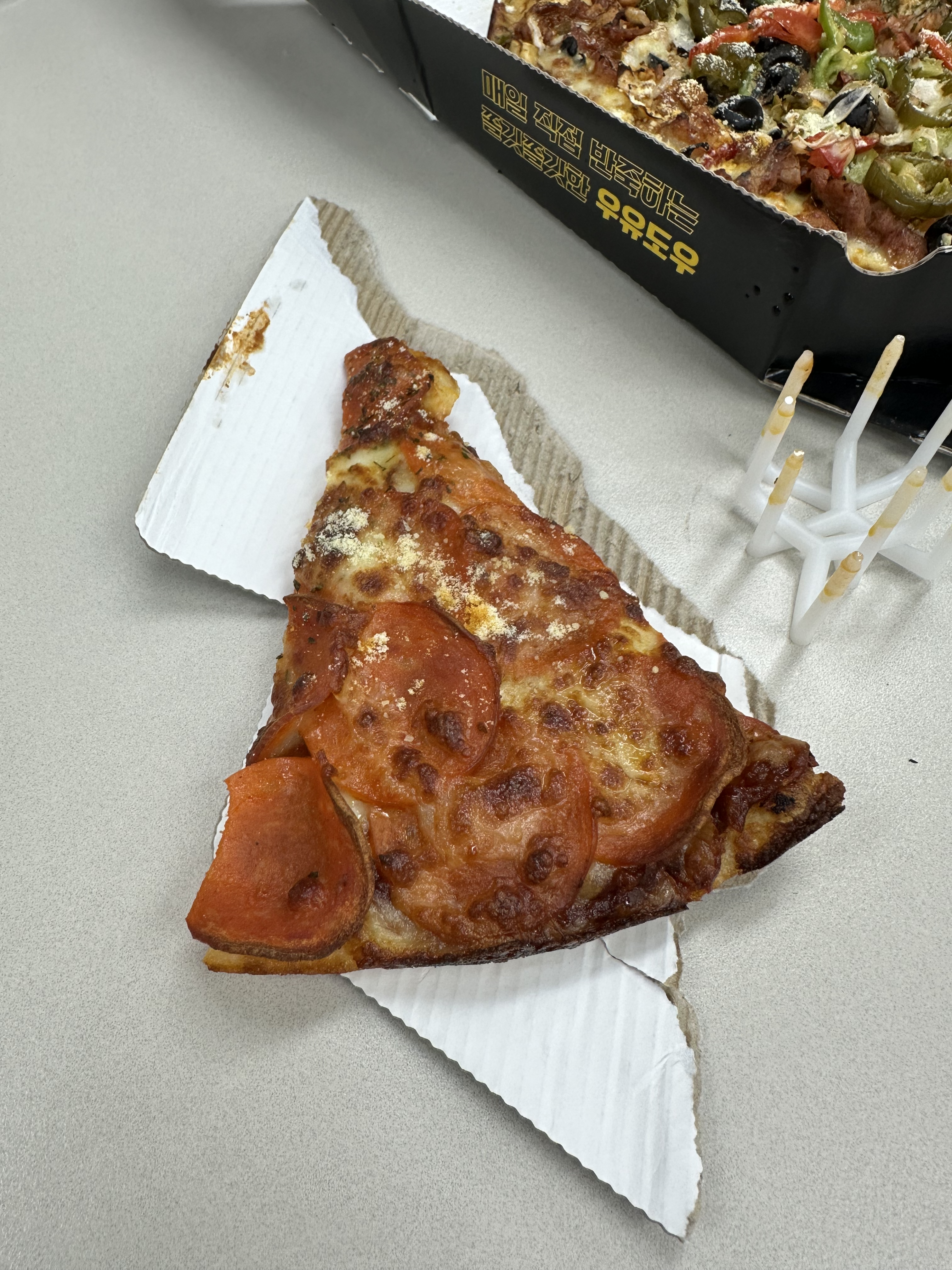 앞접시가 없어서 피자 박스 뚜껑을 자르고 찢어서 앞접시를 만들었는데..