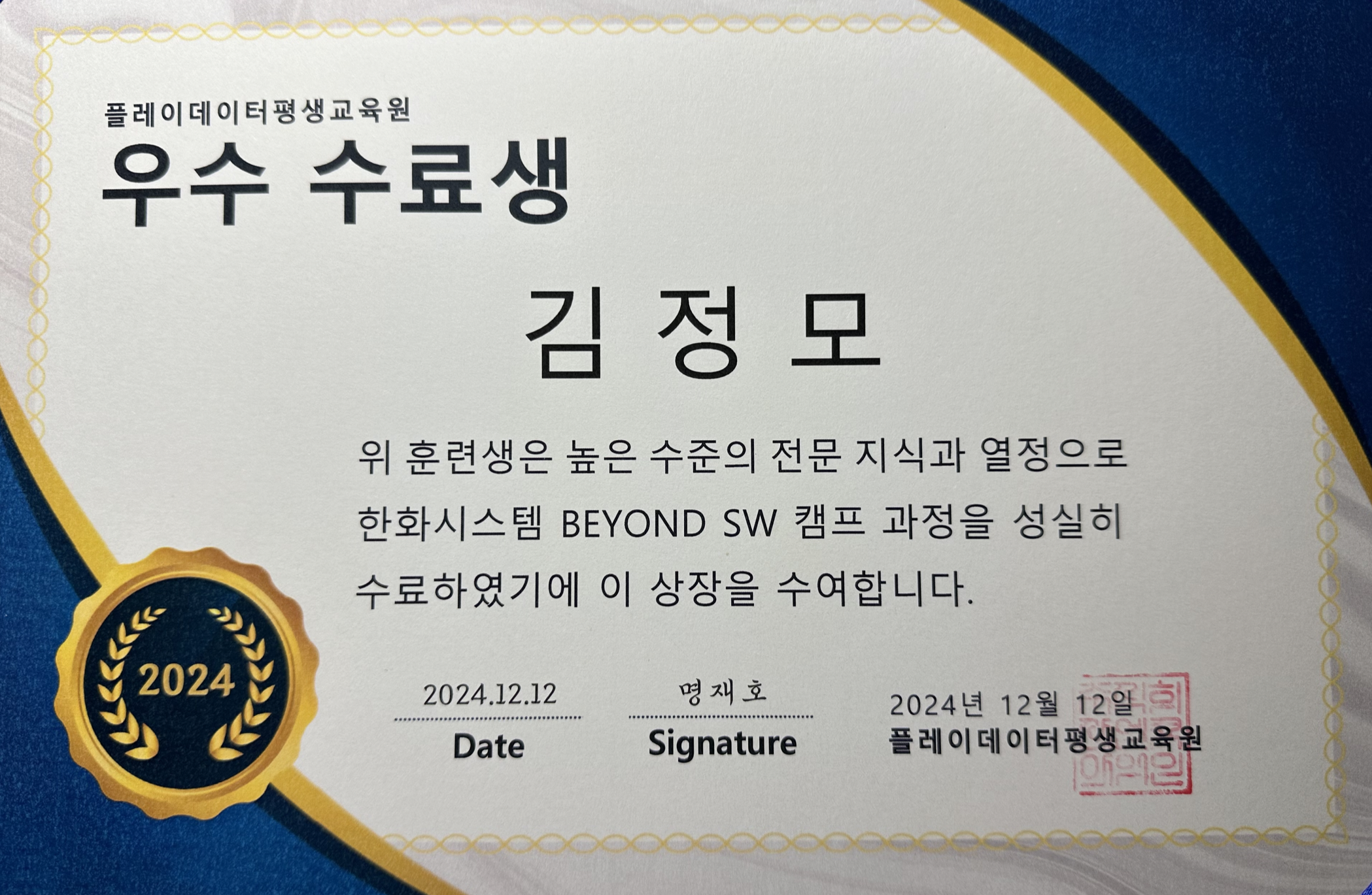 그리고 나는 운이 좋게 우수 수료생 상을 받게 되었다!!