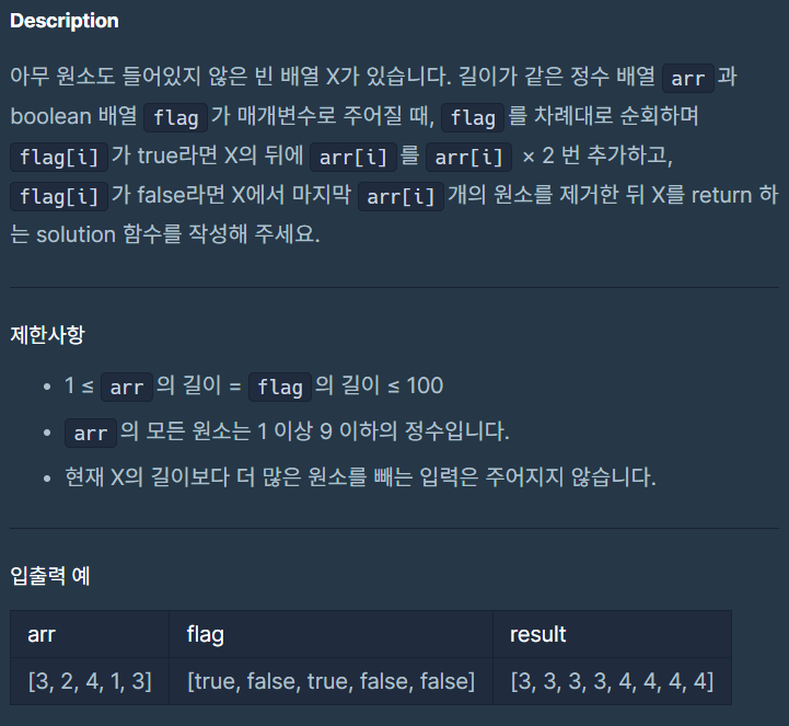 arr의 첫 번째 요소가 3이고 flag가 true이므로 3을 (3*2)번 추가한다. 그리고 arr의 두 번째 요소가 2이고 flag가 false이므로 존재하는 요소에 마지막에서 2번 삭제한다.